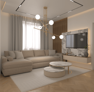 Dnevni boravak s LED trakama i prozorima prekrivenim laganim zavesama.
